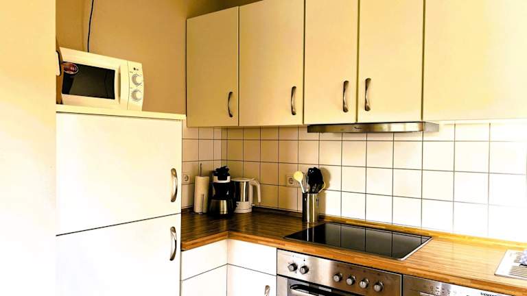 Die voll ausgestattete Küchenzeile der Ferienwohnung ermöglicht es den Gästen, selbstständig zu kochen und ihre Mahlzeiten zu geniessen. Sie ist mit einem Kühlschrank, Geschirrspüler, Waschmaschine, Ofen und Mikrowelle ausgestattet. Es gibt keine speziellen Verpflegungsmöglichkeiten vor Ort.