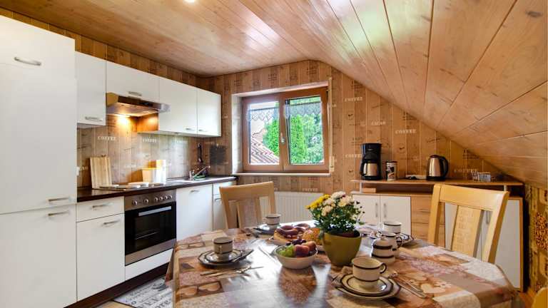 Die Ferienwohnung verfügt über eine voll ausgestattete Küche mit Kühlschrank und Kaffeemaschine, die ideal für die Zubereitung von selbstgemachten Mahlzeiten ist. Frühstücksoptionen sind nicht speziell aufgeführt.