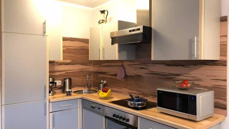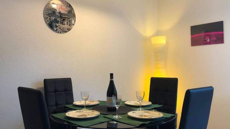 Die Ferienwohnung umfasst ein Schlafzimmer, eine moderne Küche mit Kühlschrank und Geschirrspüler sowie einen Flachbild-TV und einen Sitzbereich. Das Badezimmer ist mit einer Dusche ausgestattet. Handtücher und Bettwäsche werden bereitgestellt.
