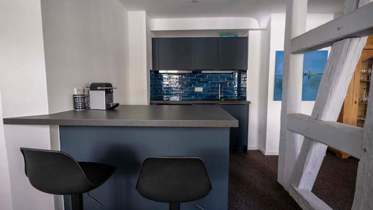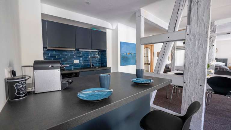 Eine Küche mit Kühlschrank und Geschirrspüler steht den Gästen zur Verfügung, um eigene Mahlzeiten zuzubereiten. Keine Verpflegungsmöglichkeiten werden angeboten.