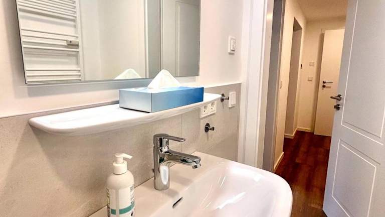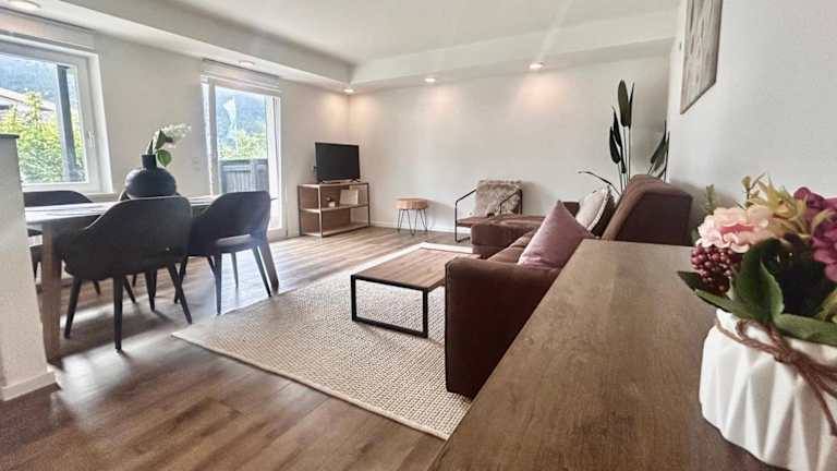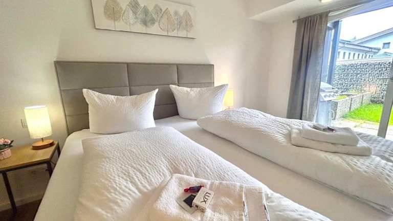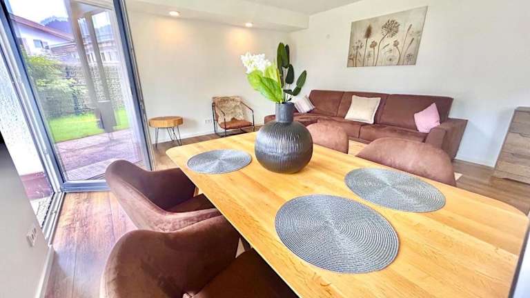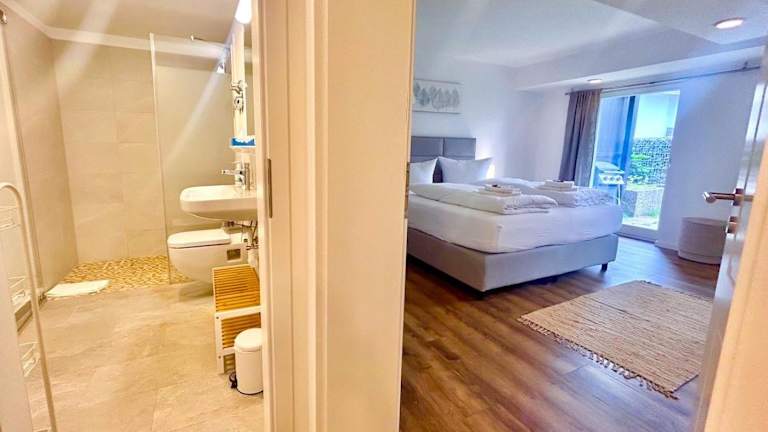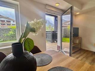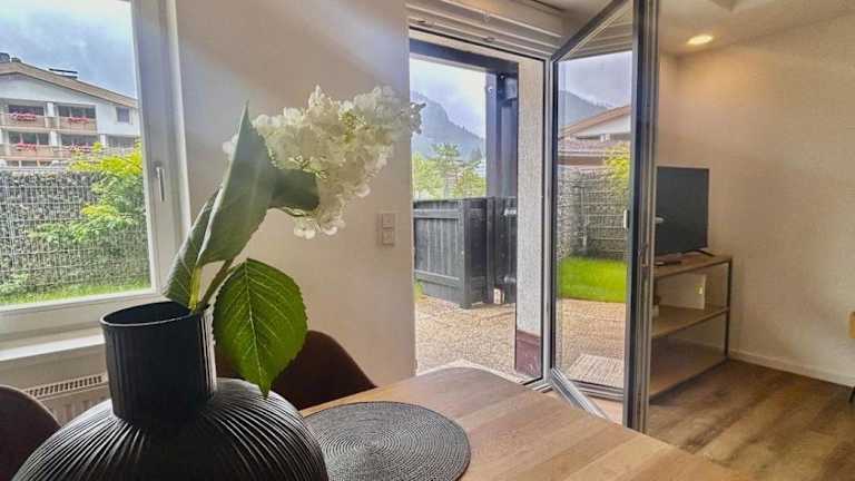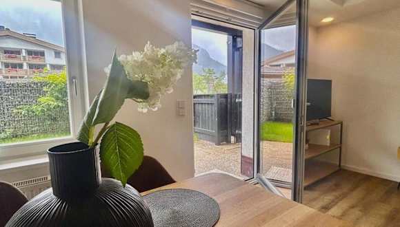 Die Ferienwohnung verfügt über ein Schlafzimmer, ein Wohnzimmer sowie eine gut ausgestattete Küchenzeile mit Kühlschrank und Geschirrspüler. Ein Badezimmer mit Dusche sowie eine Terrasse mit Blick auf die Berge stehen ebenfalls zur Verfügung. Handtücher und Bettwäsche sind in der Unterkunft vorhanden.