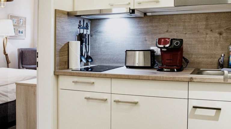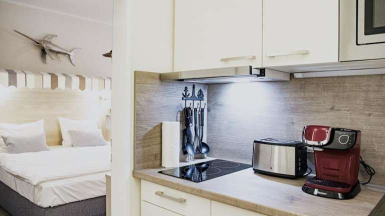 Die Küche der Ferienwohnung ist ausgestattet mit einem Kühlschrank, einer Mikrowelle, einer Herdplatte, einer Kaffeemaschine und einem Wasserkocher. Weitere Details zu den Schlafmöglichkeiten oder der allgemeinen Ausstattung der Zimmer sind nicht angegeben.