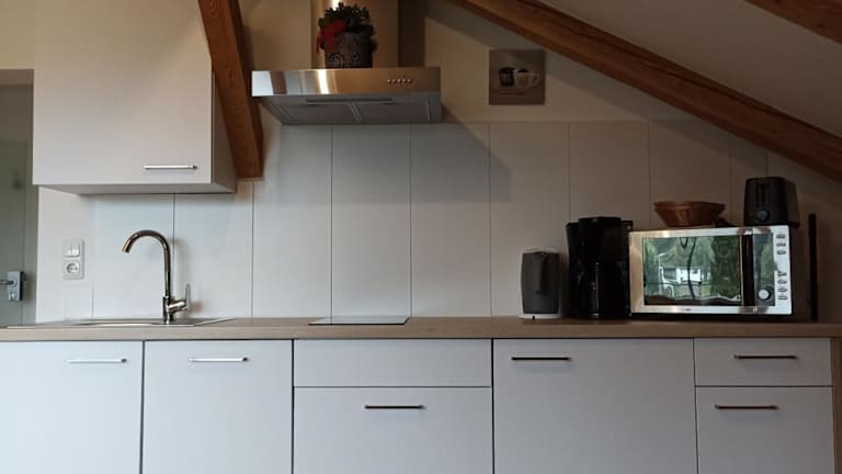 Die Ferienwohnung verfügt über ein modernes Badezimmer mit Dusche und Haartrockner. Die ausgestattete Küche bietet eine Vielzahl an Geräten, darunter Kühlschrank, Geschirrspüler, Mikrowelle, Herdplatte, Toaster, Kaffeemaschine und Wasserkocher. Zudem gibt es einen Flachbild-TV zur Unterhaltung.
