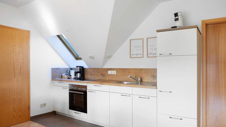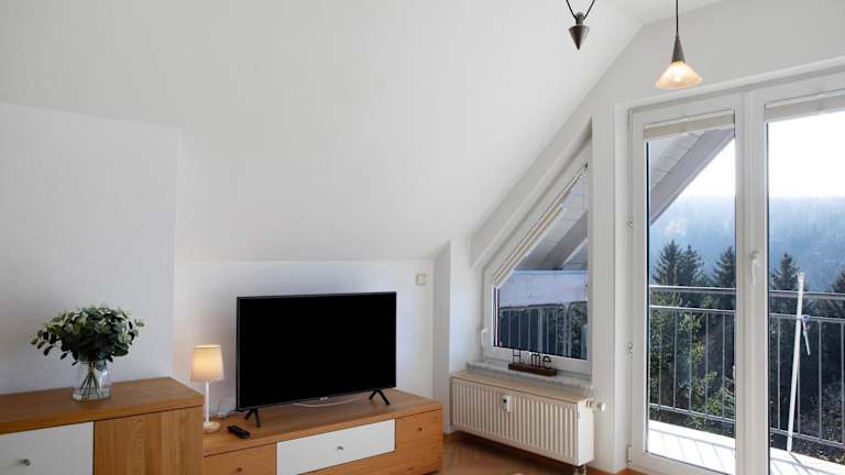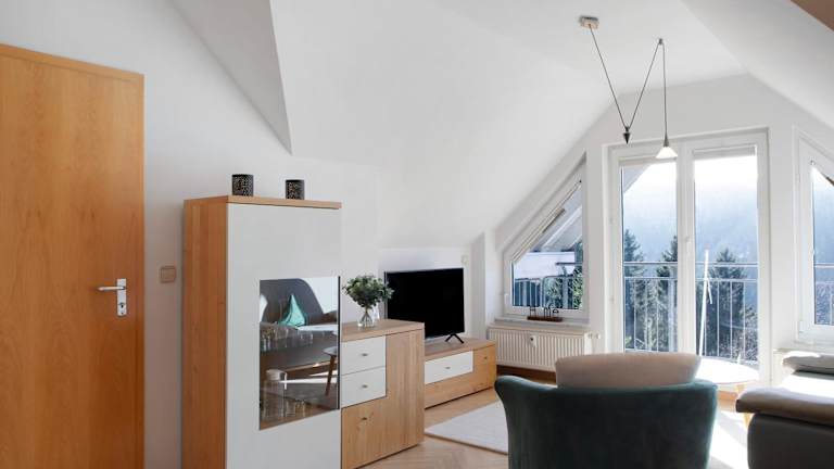 Die Ferienwohnung umfasst ein Schlafzimmer, ein Wohnzimmer, einen TV sowie eine gut ausgestattete Küche mit Kühlschrank und Geschirrspüler. Das Badezimmer ist mit einer Dusche ausgestattet. Ein Balkon mit Bergblick und die Bereitstellung von Handtüchern und Bettwäsche runden das Angebot ab.