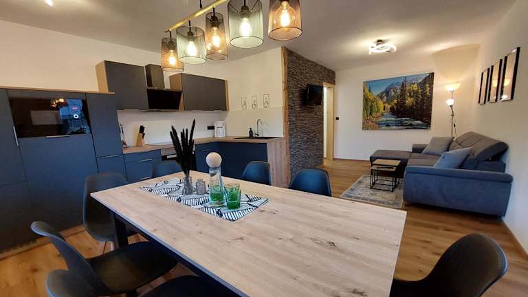 Die Küche der Ferienwohnung ist ausgestattet mit einem Kühlschrank, einem Geschirrspüler, einem Ofen, einer Kaffeemaschine und einem Wasserkocher, wodurch sich die Gäste selbst verpflegen können.