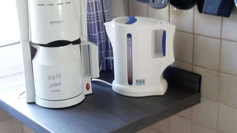 Die Ferienwohnung beinhaltet eine gut ausgestattete Küche mit Kühlschrank und Mikrowelle, wodurch Selbstverpflegung möglich ist. Essensmöglichkeiten in der Nähe sind nicht erwähnt.