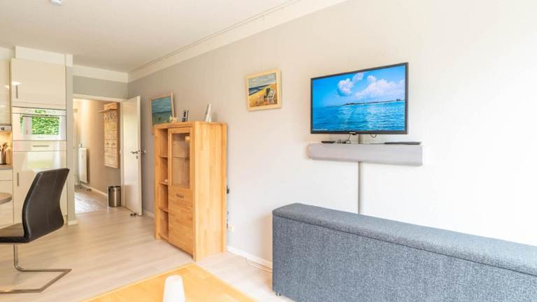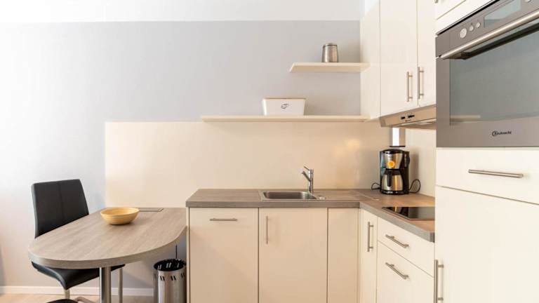 Die Küchenzeile der Ferienwohnung ist mit einem Kühlschrank, Geschirrspüler, Ofen, Kaffeemaschine und Wasserkocher ausgestattet, was eine Selbstverpflegung ermöglicht.