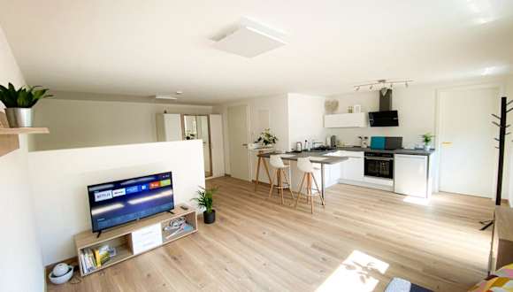 Die Ferienwohnung bietet ein Schlafzimmer, ein Wohnzimmer sowie eine voll ausgestattete Küche mit Kühlschrank und Kaffeemaschine. Zudem stehen ein Badezimmer mit Dusche und Haartrockner sowie Handtücher und Bettwäsche zur Verfügung. Ein Kinderspielplatz ist ebenfalls vorhanden.