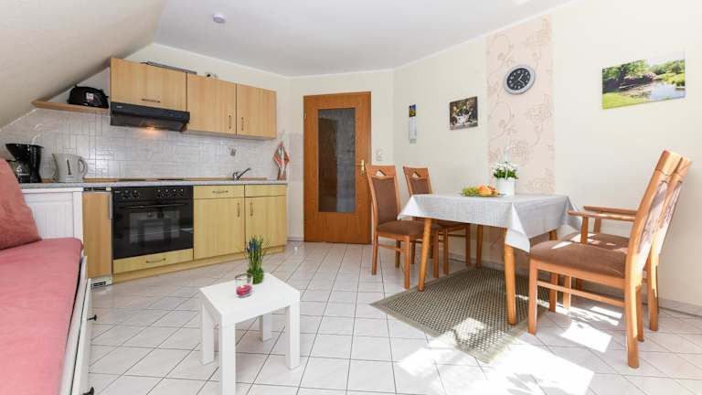 Die Ferienwohnung verfügt über ein Wohnzimmer mit einem Flachbild-TV, einer voll ausgestatteten Küche inkl. Kühlschrank und Ofen sowie ein Badezimmer mit einer Dusche. Handtücher und Bettwäsche werden bereitgestellt.
