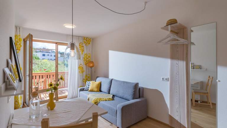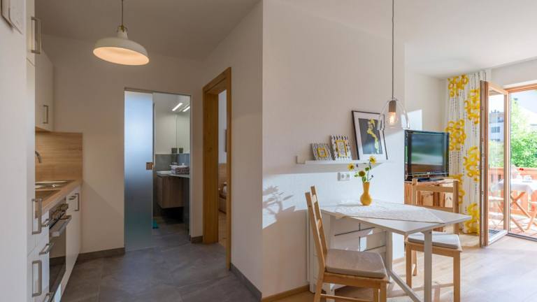 Die Ferienwohnung bietet ein Schlafzimmer, ein Wohnzimmer, einen Flachbild-TV sowie eine gut ausgestattete Küchenzeile mit Kühlschrank und Geschirrspüler. Zudem gibt es ein Badezimmer mit Dusche. Handtücher und Bettwäsche werden bereitgestellt.