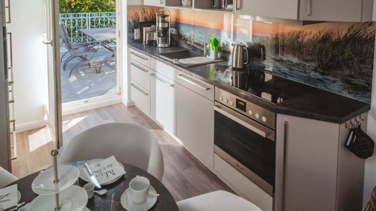 Füllende Verpflegungsmöglichkeiten können in der eigenen voll ausgestatteten Küche in der Ferienwohnung zubereitet werden, die über einen Kühlschrank und eine Kaffeemaschine verfügt.
