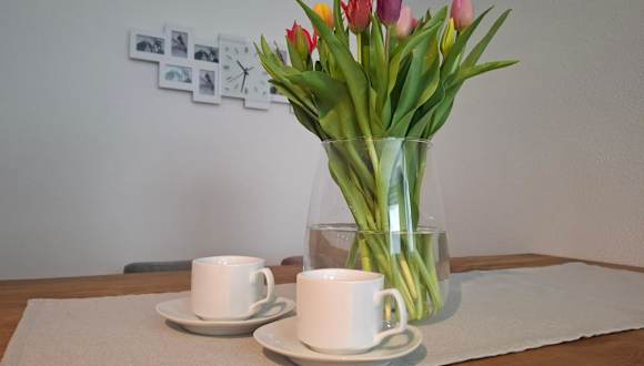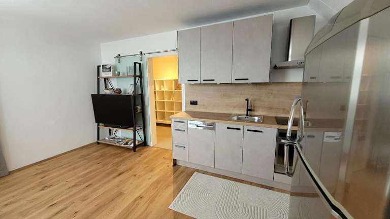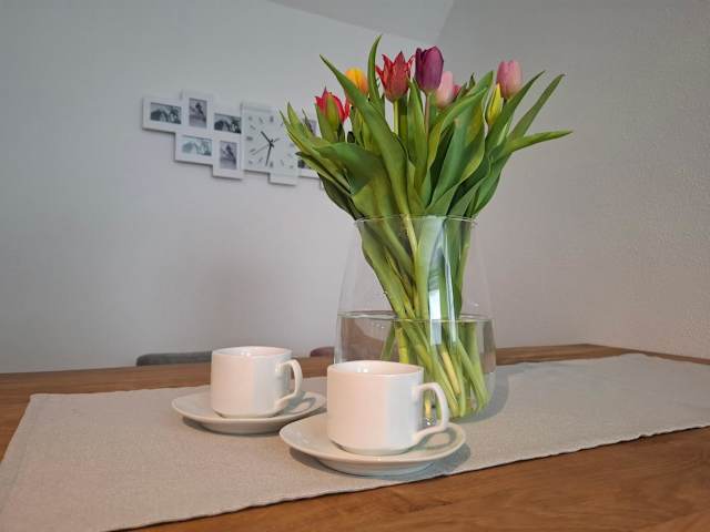 Die Ferienwohnung ist ausgestattet mit einem Schlafzimmer, einem Wohnzimmer mit einem TV mit Satellitenkanälen sowie einer voll ausgestatteten Küchenzeile, die einen Kühlschrank und einen Geschirrspüler beinhaltet. Des Weiteren gibt es ein Badezimmer mit einem Haartrockner.