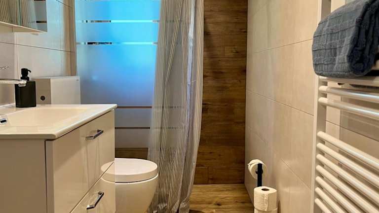 Die Ferienwohnung ist ausgestattet mit 3 Schlafzimmern und 2 Badezimmern. Zur Ausstattung gehören Bettwäsche, Handtücher, ein Flachbild-TV sowie ein Essbereich. Eine voll ausgestattete Küche ermöglicht es Gästen, ihre eigenen Mahlzeiten zuzubereiten. Zudem gibt es eine Terrasse mit wunderschönem Blick auf die Berge.