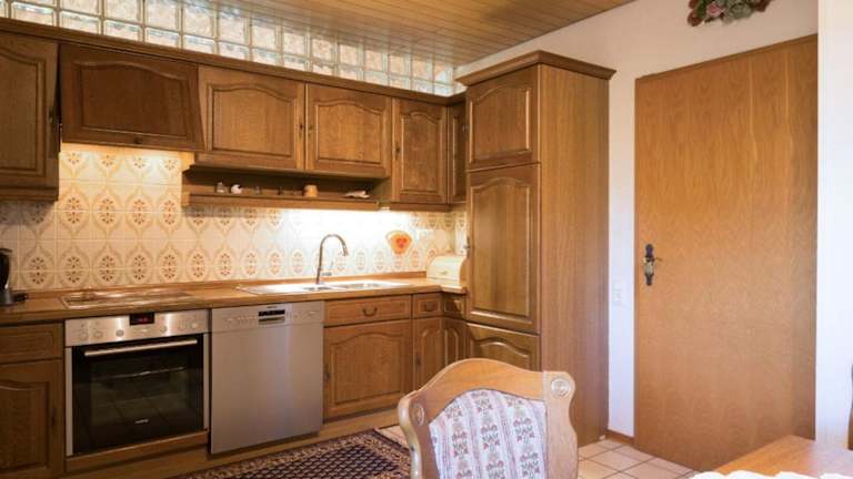 Die Ferienwohnung besitzt eine voll ausgestattete Küche, die über einen Geschirrspüler und eine Kaffeemaschine verfügt. Es sind jedoch keine spezifischen Angaben zu Verpflegungsmöglichkeiten wie Frühstück oder Halbpension vorhanden.