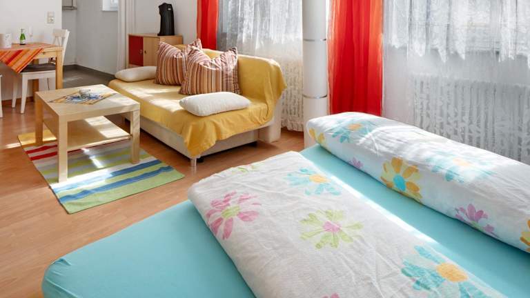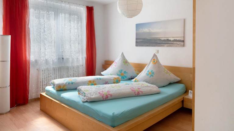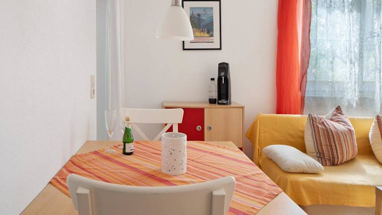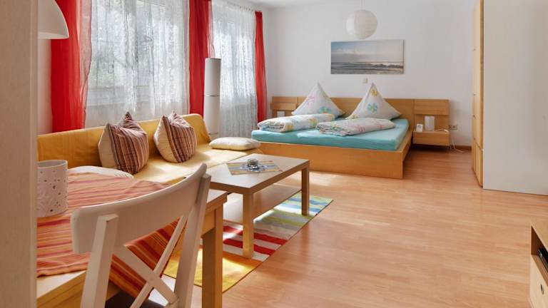 Die Ferienwohnung verfügt über ein Schlafzimmer und eine gut ausgestattete Küche mit Kühlschrank, Ofen und Kaffeemaschine. Handtücher und Bettwäsche werden zur Verfügung gestellt.