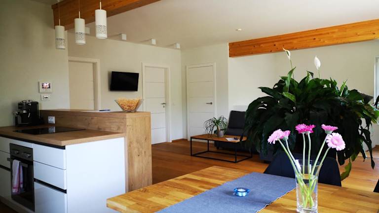 Die voll ausgestattete Küche in den Ferienwohnungen bietet Möglichkeiten zur Selbstverpflegung mit Kühlschrank, Geschirrspüler, Ofen, Mikrowelle, Herdplatte sowie Kaffeemaschine und Wasserkocher. Essenslieferungen in die Unterkunft sind möglich.