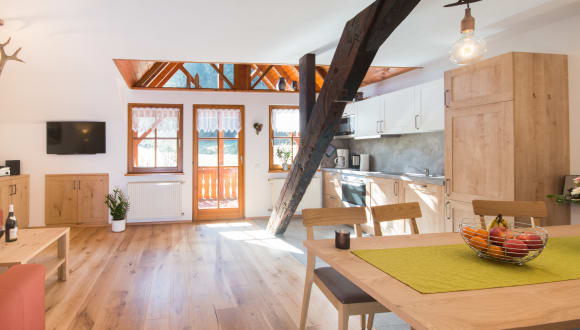 Unsere drei Ferienwohnungen befinden sich im Dachgeschoss unseres Hofgebäudes mit einem separaten Eingang. Jede Wohnung hat Ihren eigenen Charme und ist mit Echtholzböden und -möbel vom Schreiner individuell ausgestattet. Lichtdurchflutete, großzügige Räume und eine moderne, hochwertige Ausstattung erwarten Sie. Mit viel Liebe zum Detail wurden Farben und Formen liebevoll ausgewählt, sodass Sie sich sofort Zuhause fühlen werden. Alle Wohnungen verfügen über einen jeweils seperaten sonnigen Balkon, der zum Entspannen und Genießen der Natur einlädt. Wir sind sehr stolz, dass wir bei der Klassifizierung durch den Deutschen Tourismusverband e.V. die höchste Stufe erreicht haben: 5 Sterne. Das heißt laut DTV: "Erstklassige Gesamtausstattung mit exklusivem Komfort. Großzügiges Angebot in herausragender Qualität mit sehr gepflegtem, außergewöhnlichem Gesamteindruck." Wir verwenden hochwertige Leder, Microfaserstoffe und synthetische Bettwäsche und freuen uns deshalb nun auch Sie als Allergiker bei uns begrüßen zu dürfen. Deswegen können wir aber keine Haustiere zulassen und das Rauchen ist selbstverständlich nur auf den Balkonen gestattet. Großen Wert legen wir auf die Erhaltung der Umwelt und haben deswegen die Wohnungen bewusst komplett mit optimal ausleuchtenden LEDs und energiesparenden Geräten ausgestattet. Wir bevorzugen natürliche Materialien und benutzen so wenig wie möglich Kunststoffe. Zudem erzeugen wir Strom mit einer Photovoltaik-Anlage und heizen mit Brennholz aus dem eigenen Wald.