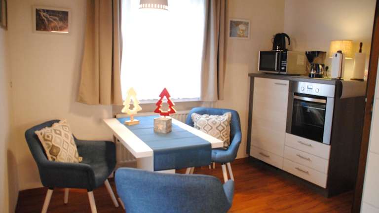 Die voll ausgestattete Küche in den Ferienwohnungen beinhaltet einen Kühlschrank, einen Ofen, eine Mikrowelle, eine Herdplatte, einen Toaster sowie eine Kaffeemaschine und einen Wasserkocher. Den Gästen steht somit die Möglichkeit zur Verfügung, sich selbst zu verpflegen und frisch zubereitete Mahlzeiten zu geniessen.