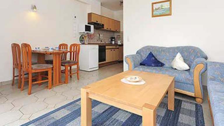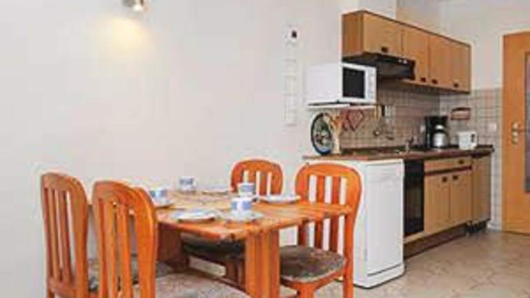 Die Ferienwohnungen sind mit einer voll ausgestatteten Küche ausgestattet, die einen Kühlschrank enthält. Weitere Verpflegungsmöglichkeiten sind nicht aufgeführt.