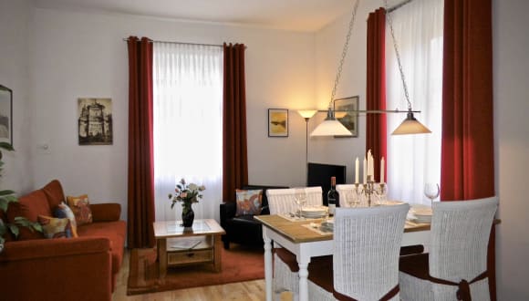 Ferienwohnung 'Friedrich Rückert' Unsere Ferienwohnung 'Friedrich Rückert' im Erdgeschoss ist aufgrund der Lage auch für ältere Gäste zu empfehlen. Hier können bis zu fünf Gäste bequem wohnen. Die Küche ist groß genug, um auch für eine größere Runde aufzukochen. Das Bad hat keine Badewanne, dafür aber eine sehr komfortable Walk-in-Dusche.... nicht nur für Warmduscher! Ferienwohnung 'Ernst Moritz Arndt' Unsere neueste Wohnung hat eine luxuriöse Einbauküche, die keine Wünsche offen lässt. Unter anderem finden Sie hier ein Induktionskochfeld und einen Multifunktionsbackofen von Bosch, der Kühlschrank verfügt über ein separates Eisfach und die vollintegrierte Spülmaschine ist ebenso wie die Waschmaschine besonders leise. In den Wohnräumen finden Sie neben ganz neuen Möbeln auch einige Antiquitäten. Wir sind sicher, dass Sie sich wohlfühlen werden! Es besteht die Möglichkeit, diese Wohnung zusammen mit der angrenzenden Wohnung 'August von Platen' zu nutzen. Dann können bis zu 10 Personen übernachten. Ferienwohnung 'August von Platen' Unsere kleinste Ferienwohnung 'August von Platen' ist vom Komfort genauso groß wie die anderen Wohnungen im Haus, denn sie besitzt zusätzlich einen Balkon und eine kleine verglaste Loggia mit Rundbogenfenstern und Blick ins Grüne, die als Schreib- oder Lesekabinett genutzt werden kann. Das WC ist nicht im Bad integriert, sondern separat. Diese Wohnung ist gut geeignet für zwei Personen. Für die dritte und vierte Person steht im Wohnzimmer ein sehr bequemes Bettsofa (140 x 200 cm) bereit. Es besteht die Möglichkeit, diese Wohnung zusammen mit der angrenzenden Wohnung 'Ernst Moritz Arndt' zu nutzen. Dann können bis zu 9 Personen übernachten.