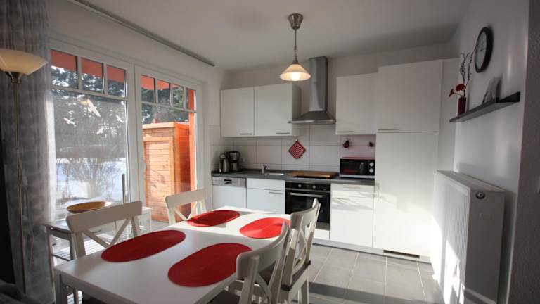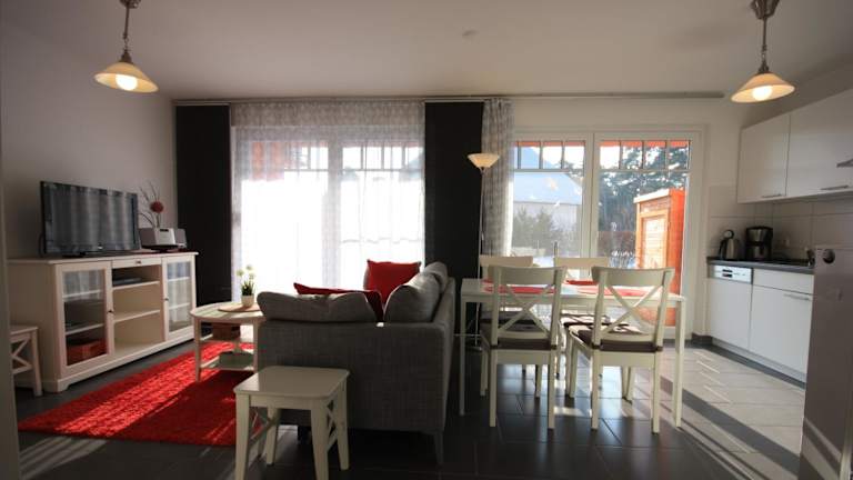 Das Apartment verfügt über zwei separate Schlafzimmer, einen Essbereich und ein grosses Wohnzimmer. Die Küche ist ausgestattet mit Kühlschrank, Herd, Backofen und Geschirrspüler. Allergikerfreundliche Zimmer sind ebenfalls verfügbar. Zudem stehen WLAN und Heizung zur Verfügung.