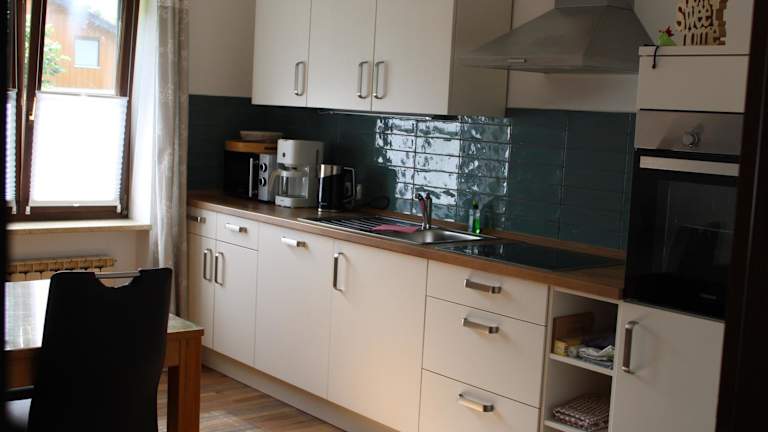 Die Küchen der Ferienwohnungen sind mit einem Kühlschrank, Geschirrspüler, Ofen, Mikrowelle, Herdplatte, Toaster, Kaffeemaschine und Wasserkocher ausgestattet, sodass Gäste sich nach Belieben verpflegen können.