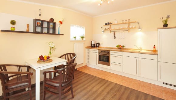 Fernseher, Radio, Küche, Balkon, Terreasse, Badezimmer, Haartrockner, Dusche, WC, Die hell und modern ausgestatteten Ferienwohnungen bieten Schlafgelegenheiten für 2 – 4 Personen. Die Wohnungen bestehen aus Schlaf- und Wohnzimmer sowie Küche, Bad und Flur. Das Schlafzimmer ist gemütlich mit einem Doppelbett und Nachtschränkchen eingerichtet. Im Wohnzimmer können Sie es sich auf einer Couch – die mit Schlaffunktion ausgestattet ist – gemütlich machen. Mit Kabelfernsehen, Radio, CD und DVD-Player bietet Ihnen das Wohnzimmer auch bei schlechtem Wetter genügend Abwechslung. Des Weiteren hält die Küche einen separaten Essplatz für Sie bereit. Im Badezimmer befinden sich die Dusche und WC sowie ein Haartrockner. Platz für Ihre Reisekleidung finden Sie im begehbaren Kleiderschrank im Flur der Wohnung. Sollten die Kleidungsstücke in der Tasche etwas aus der Form geraten sein, bekommen Sie selbstverständlich auch auf Anfrage ein Bügelbrett sowie ein dazugehöriges Bügeleisen. Abgerundet werden die Wohnungen letztlich durch die sonnigen Balkone