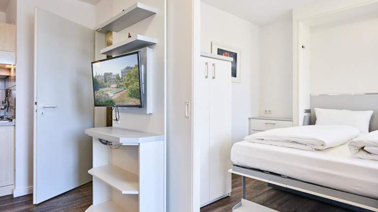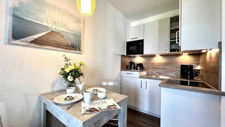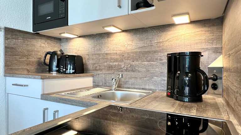 Die Ferienwohnung besteht aus einem Schlafzimmer, einem Wohnzimmer sowie einer voll ausgestatteten Küchenzeile mit Kühlschrank und Kaffeemaschine. Das Badezimmer ist mit einer Dusche und einem Haartrockner ausgestattet. Zudem gibt es einen TV.