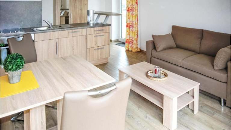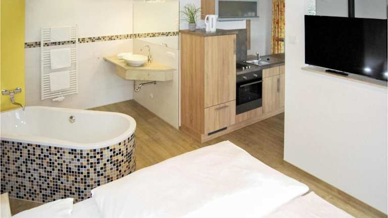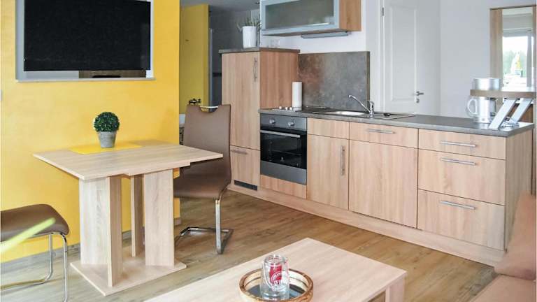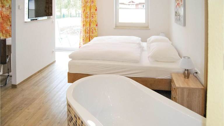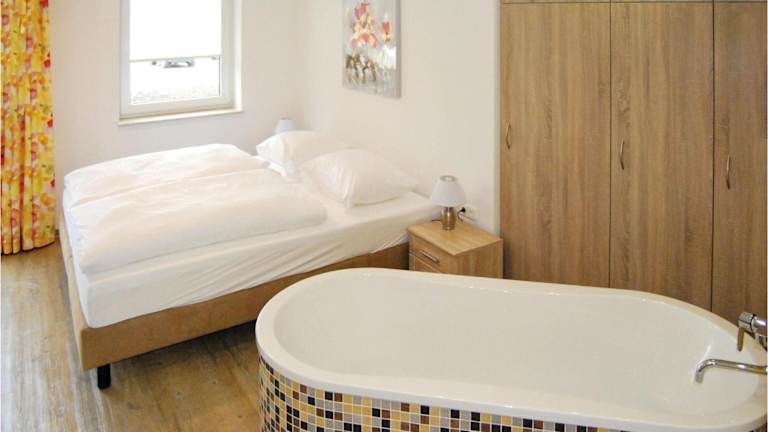 Die Ferienwohnung verfügt über 1 Schlafzimmer, ein Wohnzimmer, eine voll ausgestattete Küche mit Kühlschrank und Kaffeemaschine sowie ein Badezimmer mit Dusche und Badewanne. Ein TV ist ebenfalls vorhanden.