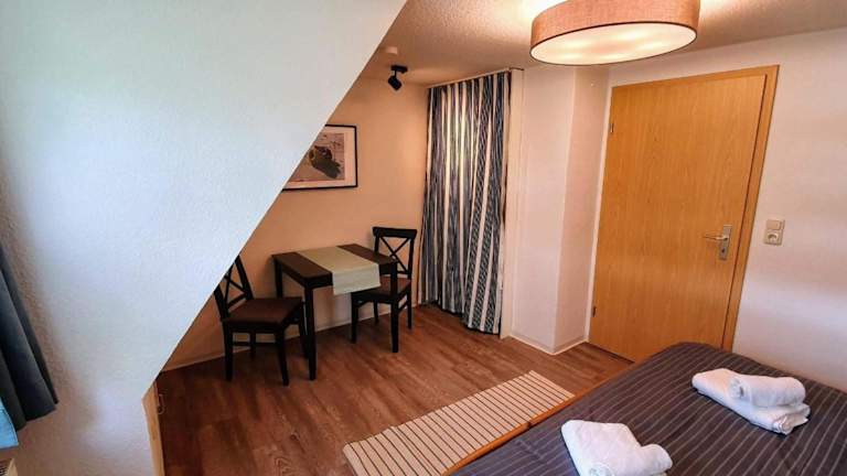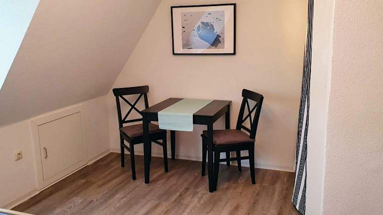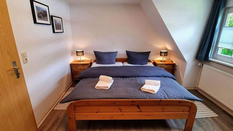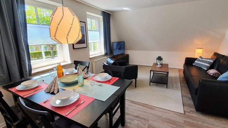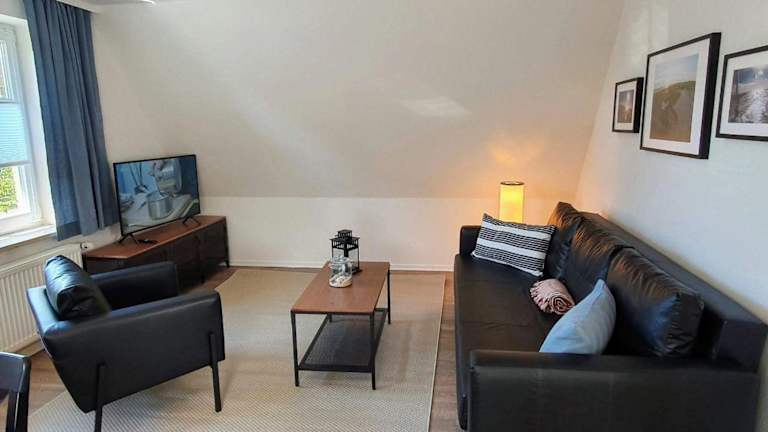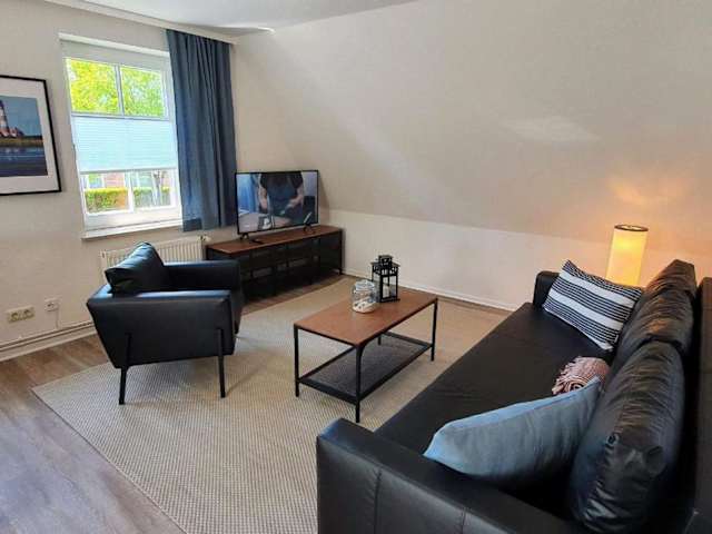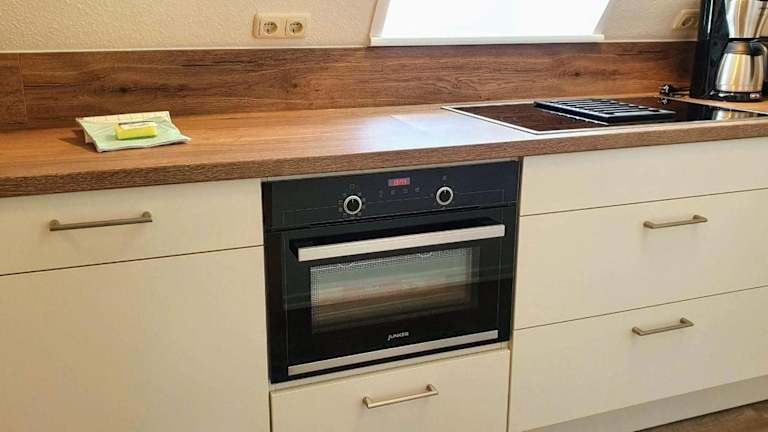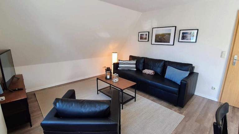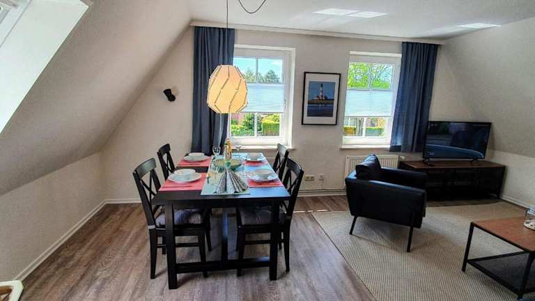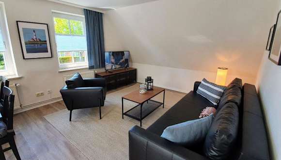 Die FeWo Dünenblick OG rechts bietet eine heimelige Atmosphäre und besteht aus einem Schlafzimmer, einem gut ausgestatteten Wohnbereich sowie einem Badezimmer mit Dusche. Die Ausstattung umfasst unter anderem einen TV und eine vollständig eingerichtete Küche mit Geschirrspüler und Ofen. Die Unterkunft ist ideal für Gäste, die eine ruhige Ferienunterkunft mit Zugang zum Strand suchen.
