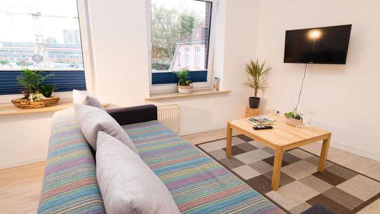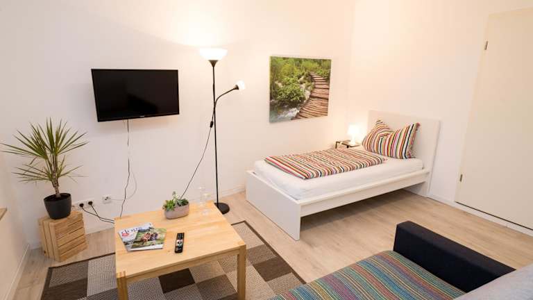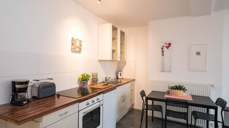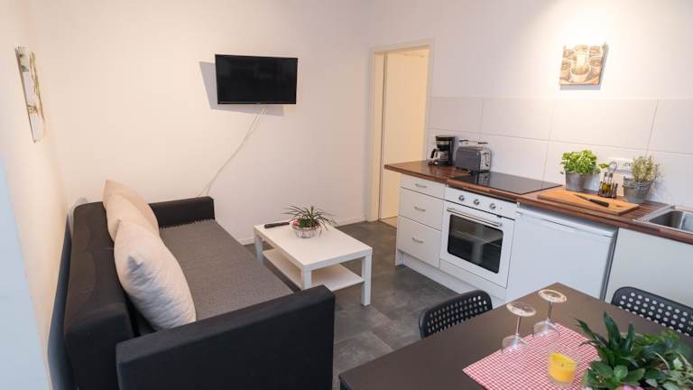 Die Ferienwohnung umfasst ein Schlafzimmer sowie ein Wohnzimmer, das mit einem Flachbild-TV mit Satellitenkanälen ausgestattet ist. Eine voll ausgestattete Küche mit Kühlschrank und Ofen bietet die Möglichkeit zur Selbstverpflegung. Zum Badezimmer gehört eine Dusche. Handtücher und Bettwäsche werden bereitgestellt.