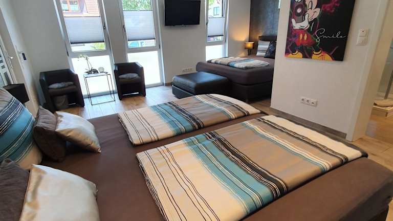 Die FeWo Gruseck ist eine moderne Unterkunft mit zwei Vierbettzimmern, die jeweils über einen eigenen Eingang verfügen. Jedes Zimmer hat eine Fussbodenheizung, einen TV sowie ein eigenes Bad mit Dusche. Die Unterkunft wird privat geführt, was eine persönliche Atmosphäre schafft. Sie legt Wert auf die Einhaltung von Ruhe und Ordnung, daher sind Feiern nicht gestattet.