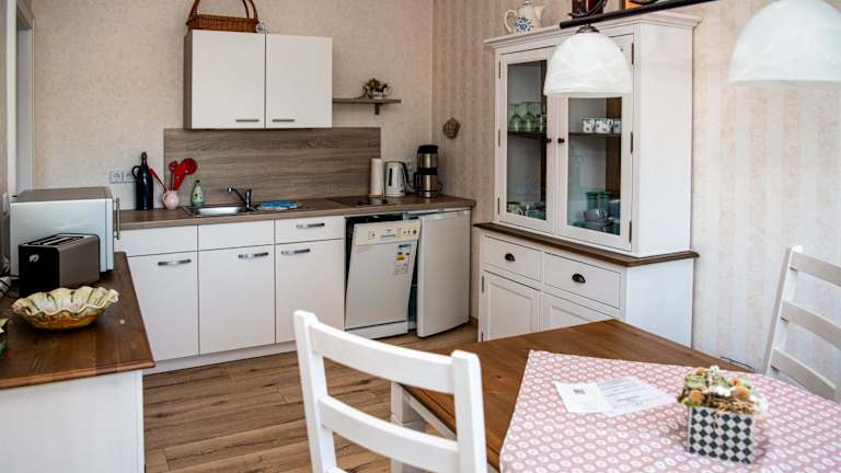 Die Ferienwohnung ist ausgestattet mit einem Schlafzimmer, einem Wohnzimmer und einer voll ausgestatteten Küche, die einen Kühlschrank und einen Geschirrspüler umfasst. Handtücher und Bettwäsche werden bereitgestellt.