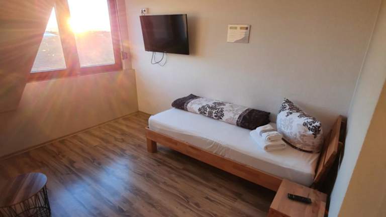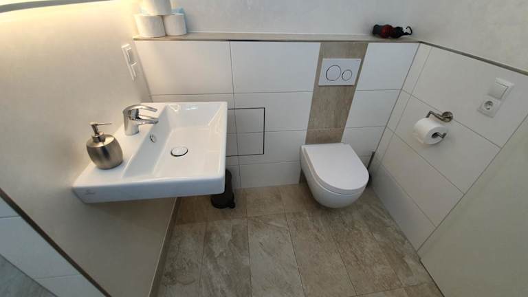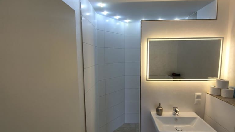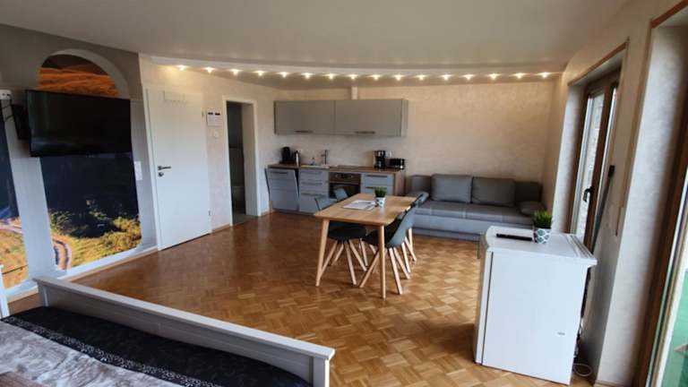 Die Wohneinheit der FeWo Lingenfeld umfasst einen Flachbild-TV mit Kabelkanälen und ein eigenes Badezimmer mit Dusche und Haartrockner, was das Wohnen bequem und angenehm gestaltet.