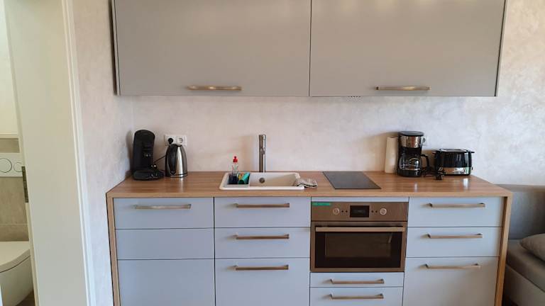 Die Unterkunft verfügt über eine voll ausgestattete Küche mit einem Esstisch, in der Gäste ihre eigenen Mahlzeiten zubereiten können. Es stehen moderne Geräte wie ein Kühlschrank, Geschirrspüler, Ofen sowie eine Kaffeemaschine und ein Wasserkocher zur Verfügung.