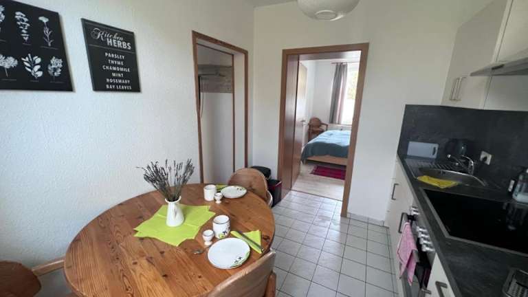 Die Ferienwohnung verfügt über ein Schlafzimmer, ein Wohnzimmer mit einem TV mit Kabelkanälen sowie eine voll ausgestattete Küche mit Kühlschrank und Ofen. Das Badezimmer ist mit einer Dusche ausgestattet.