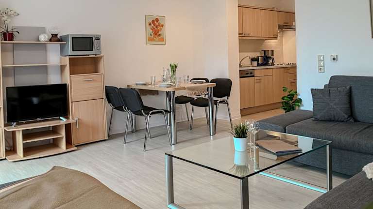 Die Ferienwohnung ist ausgestattet mit einem Wohnzimmer, einem TV, einer voll ausgestatteten Küche inklusive Kühlschrank und Geschirrspüler sowie einem Badezimmer mit Dusche. WLAN ist kostenfrei in allen Bereichen vorhanden.