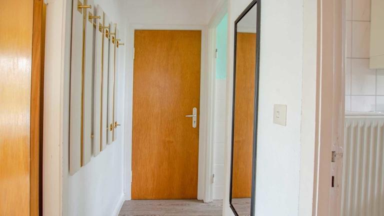 Die Ferienwohnung beinhaltet eine Küchenzeile, ausgestattet mit Kühlschrank, Herdplatte, Toaster, Kaffeemaschine und Wasserkocher, was die Zubereitung einfacher Mahlzeiten ermöglicht.