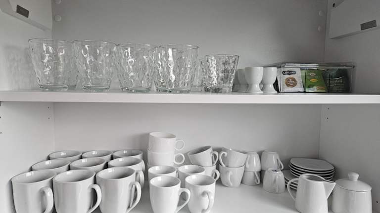 Die Ferienwohnung verfügt über eine voll ausgestattete Küche, in der die Gäste ihre eigenen Mahlzeiten zubereiten können. Es stehen ein Kühlschrank und eine Kaffeemaschine zur Verfügung.