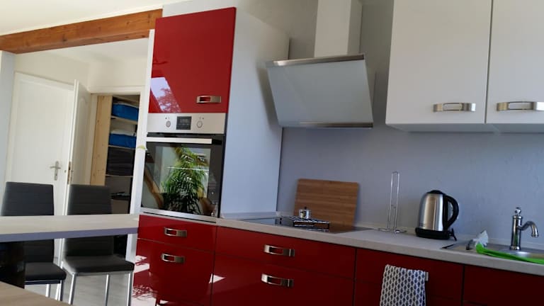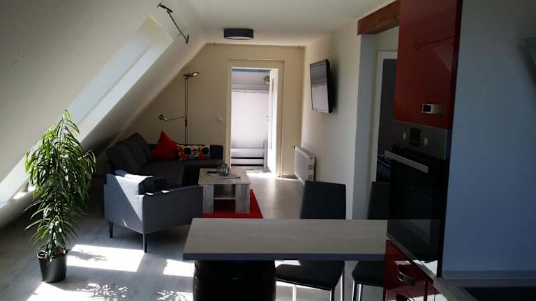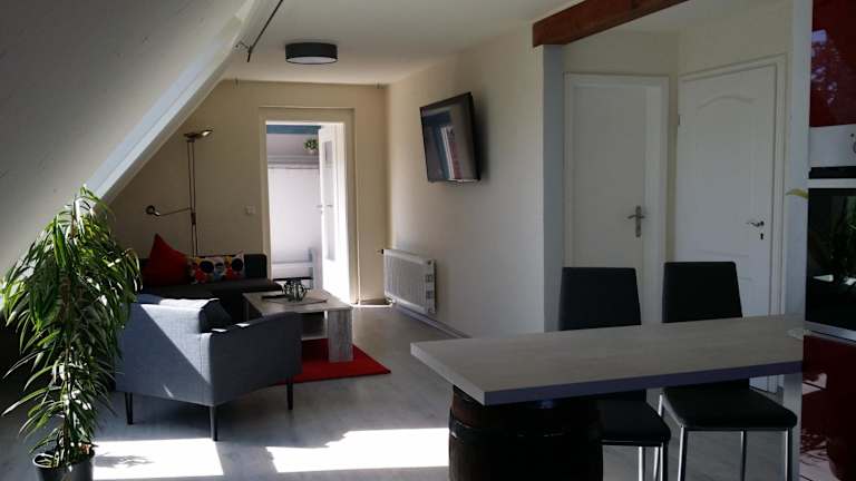 Die Ferienwohnung verfügt über ein Schlafzimmer, eine Küche mit Kühlschrank und Geschirrspüler, einen Flachbild-TV, einen Sitzbereich sowie ein Badezimmer mit Dusche. Handtücher und Bettwäsche werden bereitgestellt.