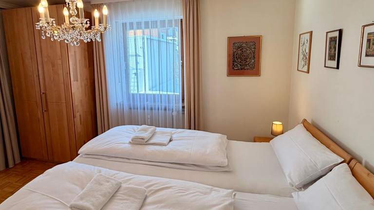 Die Ferienwohnung umfasst ein Schlafzimmer, eine Küche mit Kühlschrank und Geschirrspüler, sowie einen Sitzbereich. Ein Flachbild-TV und ein Badezimmer mit Dusche sind ebenfalls vorhanden. Handtücher und Bettwäsche werden bereitgestellt.