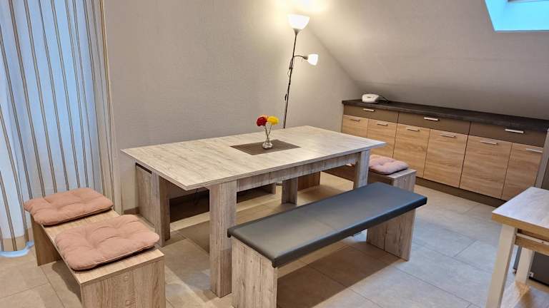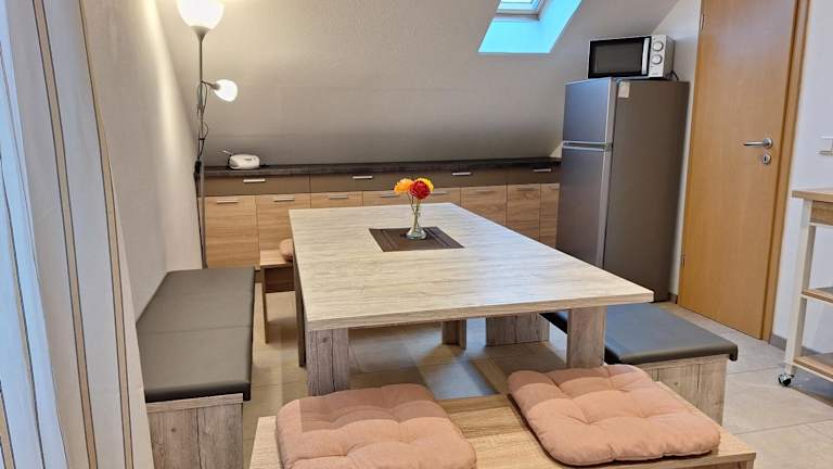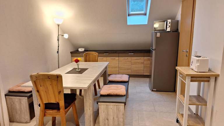 Die Ferienwohnung ist mit einer gut ausgestatteten Küchenzeile ausgestattet, die einen Kühlschrank und einen Geschirrspüler beinhaltet. Es steht eine Kaffeemaschine zur Verfügung, sodass Gäste ihren Kaffee in aller Ruhe geniessen können. Die Unterkunft bietet keine Verpflegungsmöglichkeiten an, jedoch kann eine Grillmöglichkeit auf der Sonnenterrasse genutzt werden.