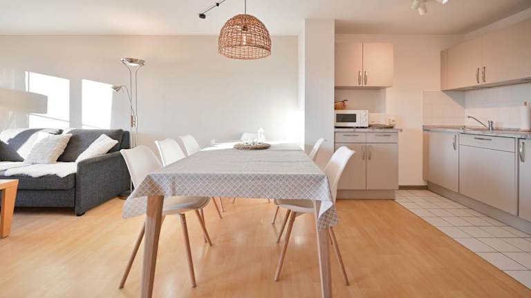 Die Ferienwohnung verfügt über eine Küchenzeile mit Kühlschrank und Geschirrspüler, wodurch die Zubereitung eigener Mahlzeiten möglich ist. Für zusätzlichen Komfort können Handtücher und Bettwäsche gegen Aufpreis bereitgestellt werden. Weitere Verpflegungsmöglichkeiten sind nicht konkret beschrieben.