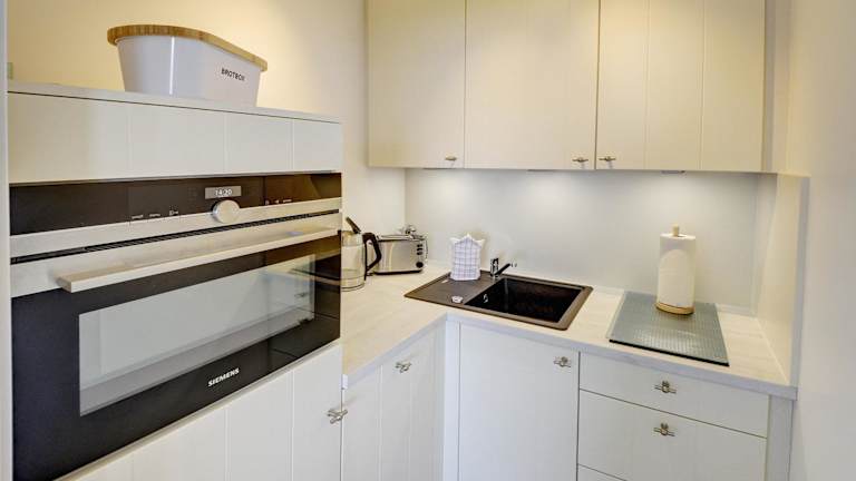 Das Studioapartment verfügt über ein Schlafzimmer, einen Flachbild-TV mit Kabelkanälen sowie eine voll ausgestattete Küche mit Kühlschrank, Geschirrspüler, Waschmaschine, Ofen und Mikrowelle. Ein Balkon mit Meerblick ergänzt die Einrichtung. Handtücher und Bettwäsche werden bereitgestellt.