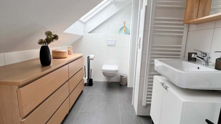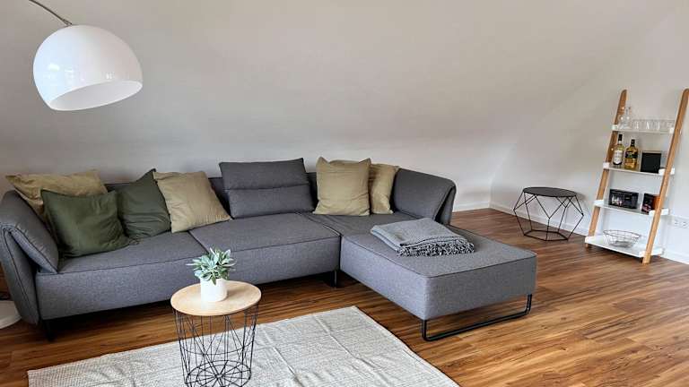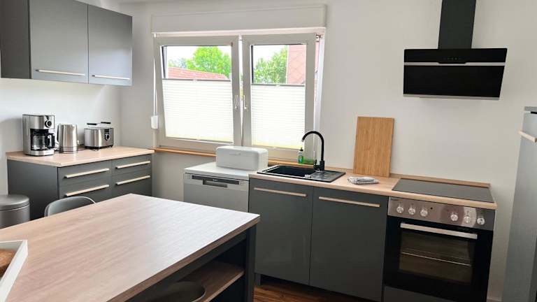 Die Ferienwohnung umfasst ein Schlafzimmer, eine Küche mit Kühlschrank und Geschirrspüler, einen Flachbild-TV, einen Sitzbereich sowie ein Badezimmer mit Dusche. Handtücher und Bettwäsche werden bereitgestellt.
