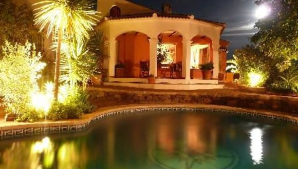 Von den verschiedenen Terrassen des Luxushauses hat man einen wirklich tollen Blick auf das nahe Mittelmeer, aber auch auf die im Winter schneebedeckten Berge der Sierra Nevada und an besonders klaren Tagen auch auf das Atlas-Gebirge in Marrokko. Neben einem kleinen, künstlichen Wasserfall - ca. 2,5 m hoch und abends per Schalter auf Wunsch sehr schön beleuchtet - werden Sie hier auch einen nach originalen Plänen erstellten Holz-Brotbackofen vorfinden. Der Brotbackofen kann selbstverständlich auch benutzt werden. Vor dem Haus gibt es eine überdachte Veranda, aber auch einen separierten, überdachten Bereich (mit Grill, extra Kühlschrank und Waschbecken), wo man gemütliche Grillabende verbringen kann. Bitte achten Sie darauf, daß ansonsten hier in Andalusien vor allem im Sommer wegen der Brandgefahr offenes Feuer verboten ist. Selbstverständlich stehen Ihnen auch genügend Sitzgelegenheiten und Liegestühle im Außenbereich zur Verfügung. Nach Cómpeta, dem nächsten Ort, sind es gerade einmal rund 5 km (ca. 5 - 10 Autominuten). Die Taxifahrer in der Umgebung nennen das Haus übrigens Finca Hollywood, da es in der Nacht so toll beleuchtet ist. Das gesamte Grundstück der Finca la Huerta ist ca. 5 Hektar groß, ca. 1.200 qm um das Haus herum sind komplett mit einem ca. 2 m hohen Zaun umgeben und der Teil hinter dem Haupthaus ist noch einmal separat mit einer Tür abgetrennt. Von daher ist dieses Domizil auch ideal für Hundebesitzer geeignet. Außerhalb des Zaunes reicht das Grundstück, auf dem Sie neben Oliven- und Avocadobäume auch wilden Spargel und Mangos sehen können, bis zur Schlucht hinunter - einfach nur Natur pur. Der nächste Nachbar wohnt ca. 100 m entfernt, so daß Sie in dem Finca la Huerta eine besonders private Atmosphäre genießen können. Die asphaltierte, sehr gut zu befahrende Straße bringt Sie von Cómpeta bis zur Haustür der Finca la Huerta. Wollen Sie hingegen den kürzeren Weg zum Meer fahren, so bedarf es hierzu ein klein wenig Mut, denn dieser, teilweise recht schlechte und enge Feldweg ist nicht befestigt und an manchen Stellen geht es an einer Seite steil bergab. Dafür sind Sie aber in knapp 30 Minuten (ca. 10 km) am Meer etwas westlich von El Morche (ca. 2 km westlich von Torrox Costa), wo Sie einen relativ breiten und nicht sehr stark besuchten Strand vorfinden werden. Einen Geländewagen benötigen Sie aber auch für diesen Weg nicht zwingend, allerdings ist es mit einem 4 x 4 Wagen natürlich wesentlich sicherer und auch angenehmer. Durchgeschüttelt wird man aber in jedem Fall, dafür sieht man auch einen kleinen "Wald mit Oleanderbäumen". Der nächste Flughafen in Málaga liegt ca. 60 Minuten in südöstlicher Richtung.