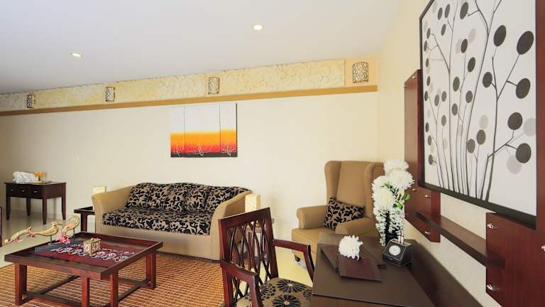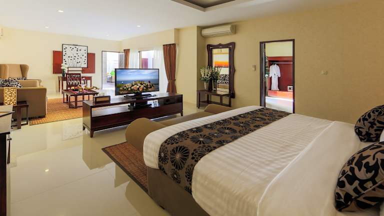 Die Zimmer verfügen über ein Wohnzimmer und ein Badezimmer mit Dusche und Badewanne. Die Ausstattung umfasst eine Klimaanlage, einen Balkon, ein Doppelbett, einen Safe, eine Minibar, ein Telefon, Sat-TV, einen DVD-Player und gratis Wifi. Die Kochnische ist mit Kühlschrank, Herd, Mikrowelle, Tee-/Kaffeekocher und Backofen ausgestattet. Hausschuhe, ein Haartrockner und Bademäntel stehen bereit.