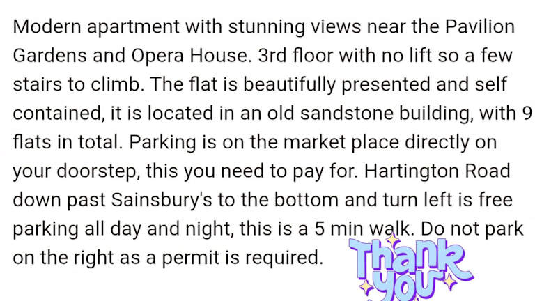 Die Unterkunft Flat 7 Buxton Market Place Apartment bietet Übernachtungsmöglichkeiten mit einer Vielzahl von Annehmlichkeiten, darunter kostenloses Wifi. Die Ferienwohnung ist von einem privaten Gastgeber geführt und richtet sich an Gäste ab 18 Jahren. Feierlichkeiten wie Junggesellenabschiede sind nicht gestattet.