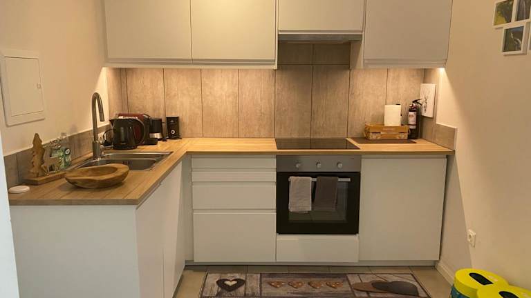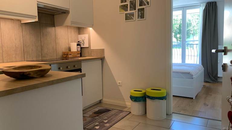 Die Ferienwohnung umfasst zwei Schlafzimmer, ein Wohnzimmer mit TV, eine gut ausgestattete Küche mit Kühlschrank und Geschirrspüler sowie ein Badezimmer mit Dusche. Handtücher und Bettwäsche werden bereitgestellt.