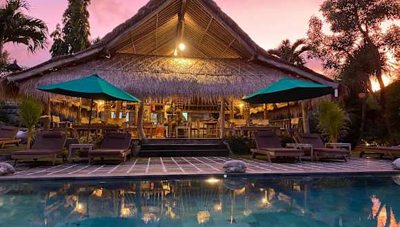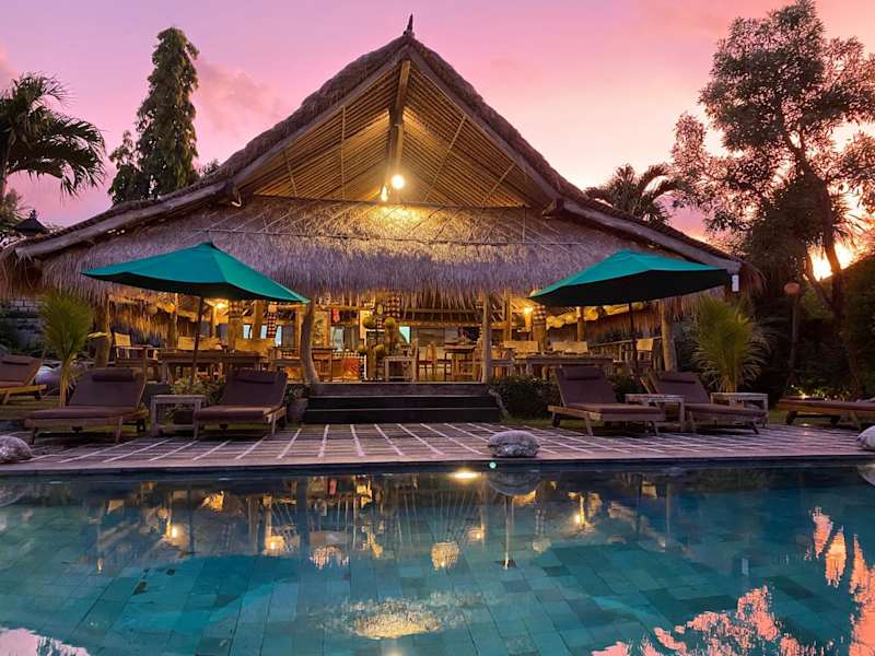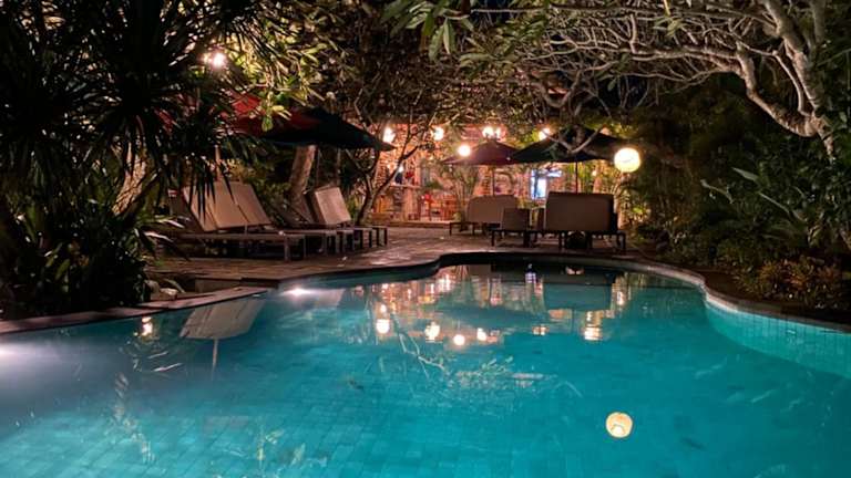 Das Restaurant im Freien bietet eine abwechslungsreiche Auswahl an balinesischen, indonesischen und internationalen Gerichten. Die Gäste können ihre Speisen neben dem Pool geniessen.